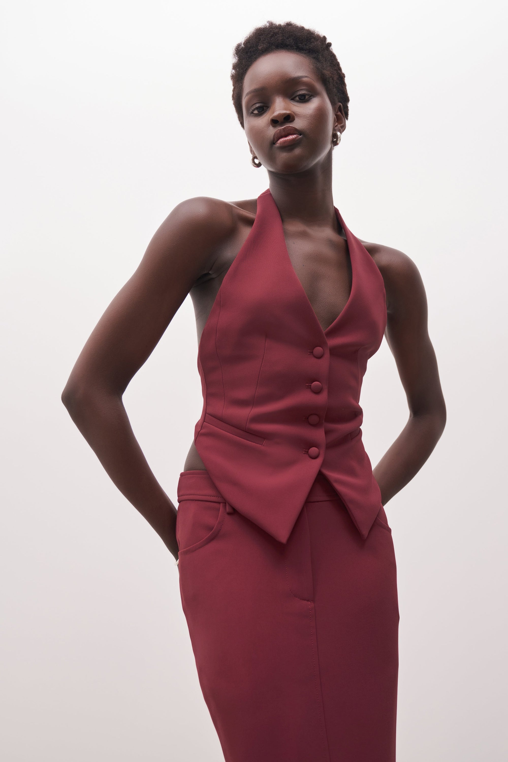 Halter neck waistcoat with an exposed back, adjustable decorative double D-ring neck and back straps, 4 button closure, bust darts and decorative welted pockets in our signature flowing effortless tailoring fabric. Fully lined.