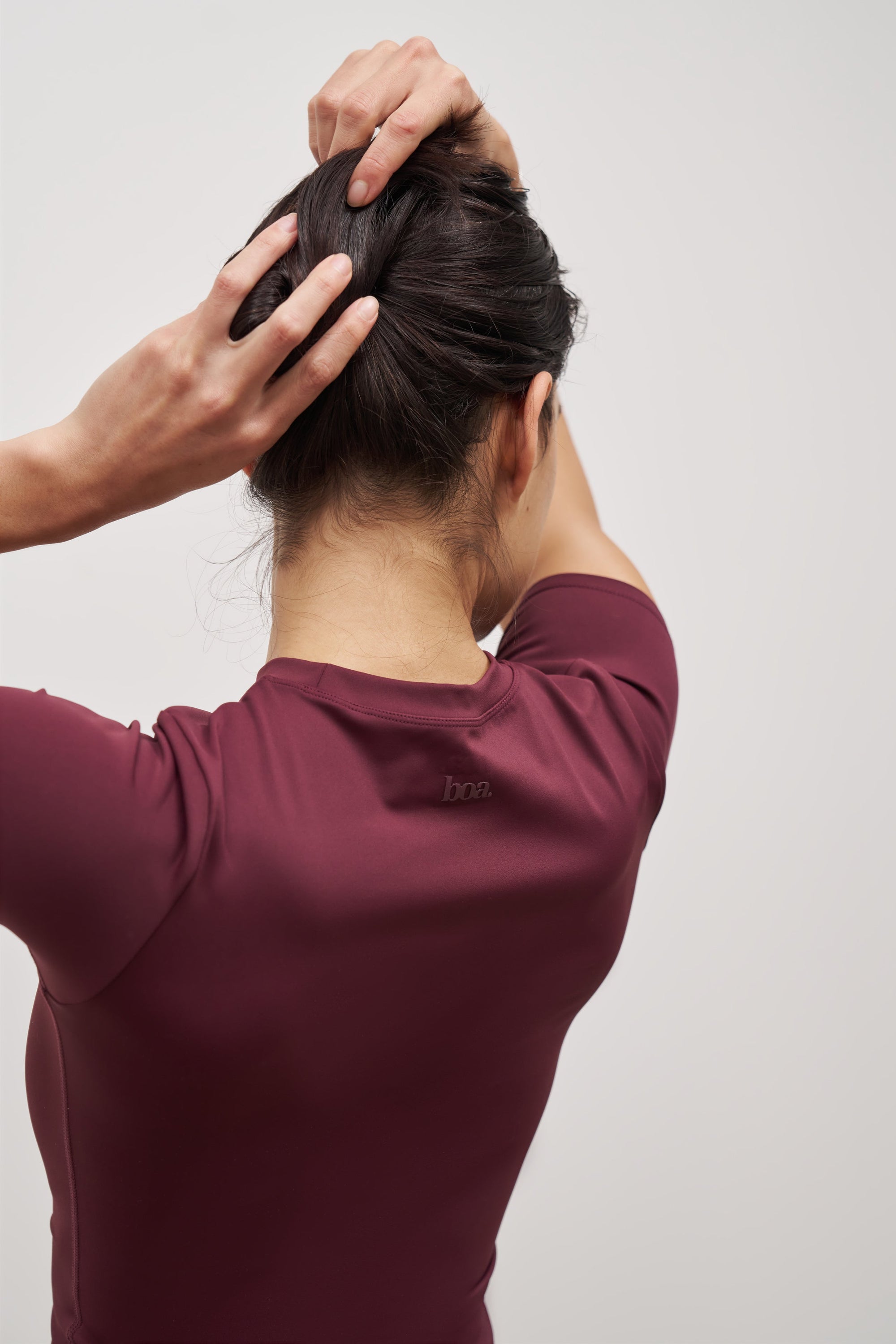 Crew neck t shirt in our signature buttery soft heavyweight BASE fabric, designed to sculpt, smooth and support your figure. Finished with cap sleeves, decorative curved hem and rubberised tonal logo at the reverse neck.