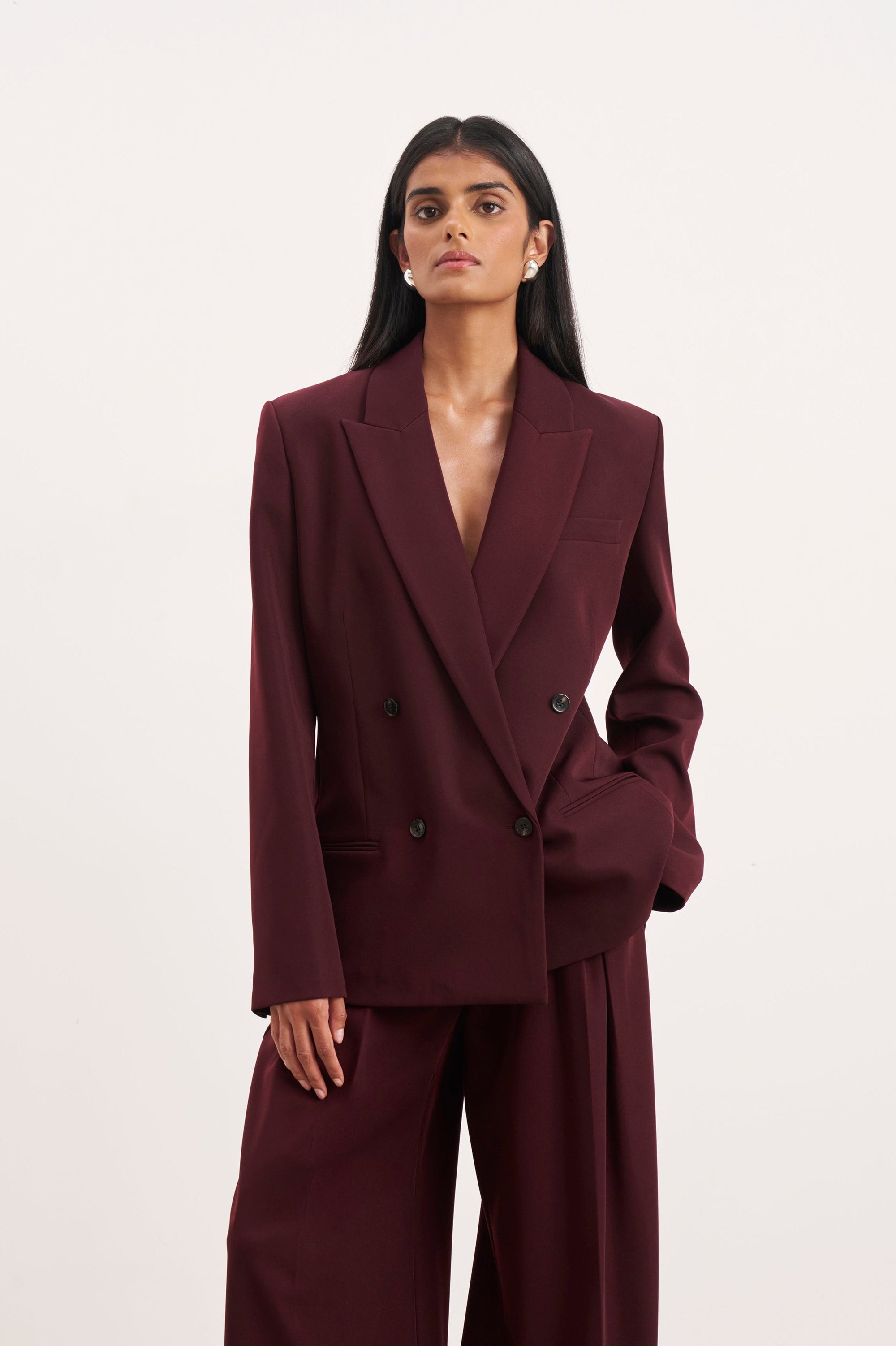 Relaxed fit double breasted blazer cut in an oversized, masculine style with a shortened hem and dropped waist in a traditional heavyweight suiting fabric. Finished with 4 button closure, sharp lapels, shoulder pads, 4 button cuffs, welted pockets and a double back vent. Fully lined.