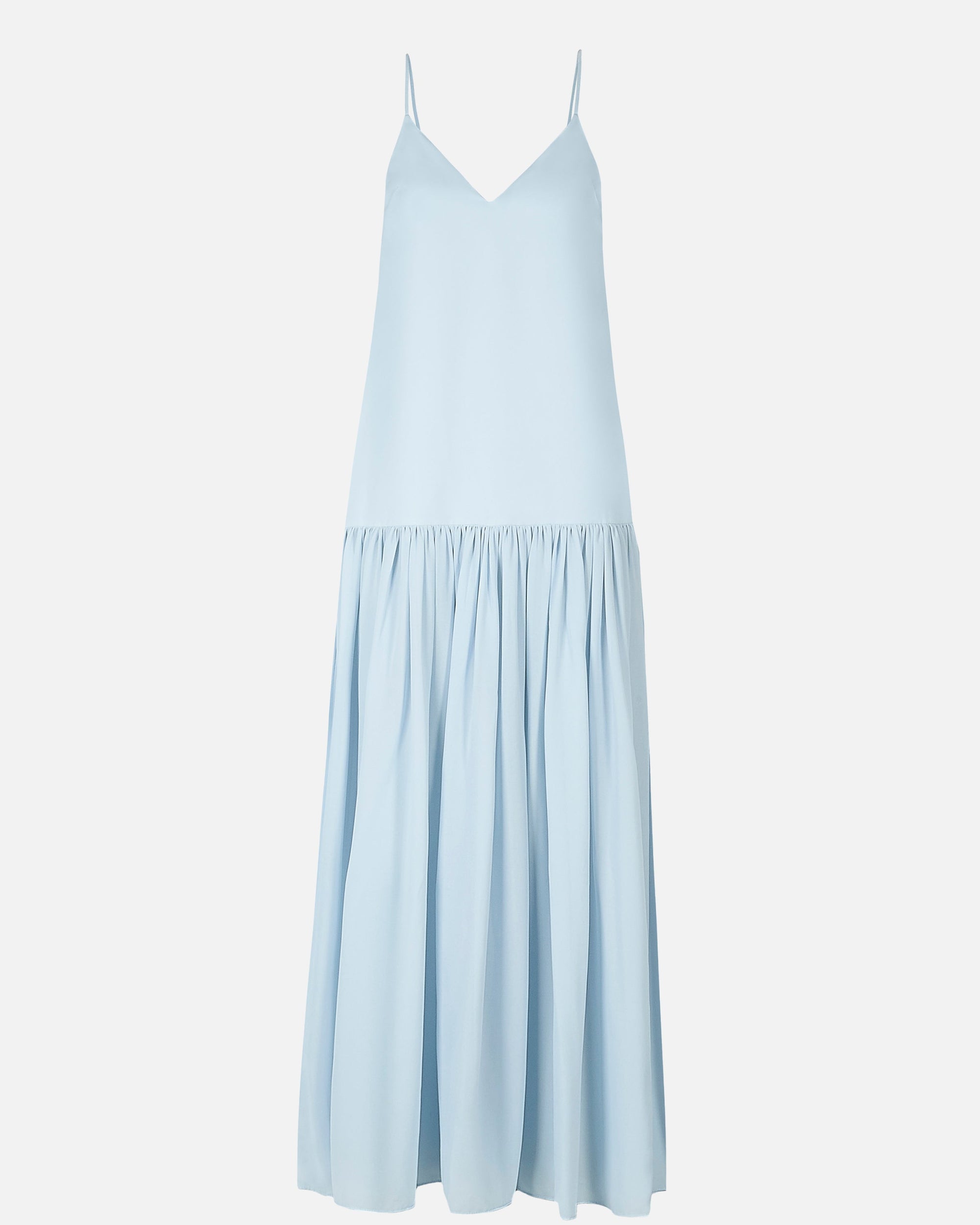 Plunging v-neck maxi dress with delicate cami straps, a straight-cut, dropped waist silhouette and a flowing semi-sheer knife pleat maxi length skirt. Finished with adjustable delicate cami straps, flattering v-cut neckline and invisible back zip. Fully lined.