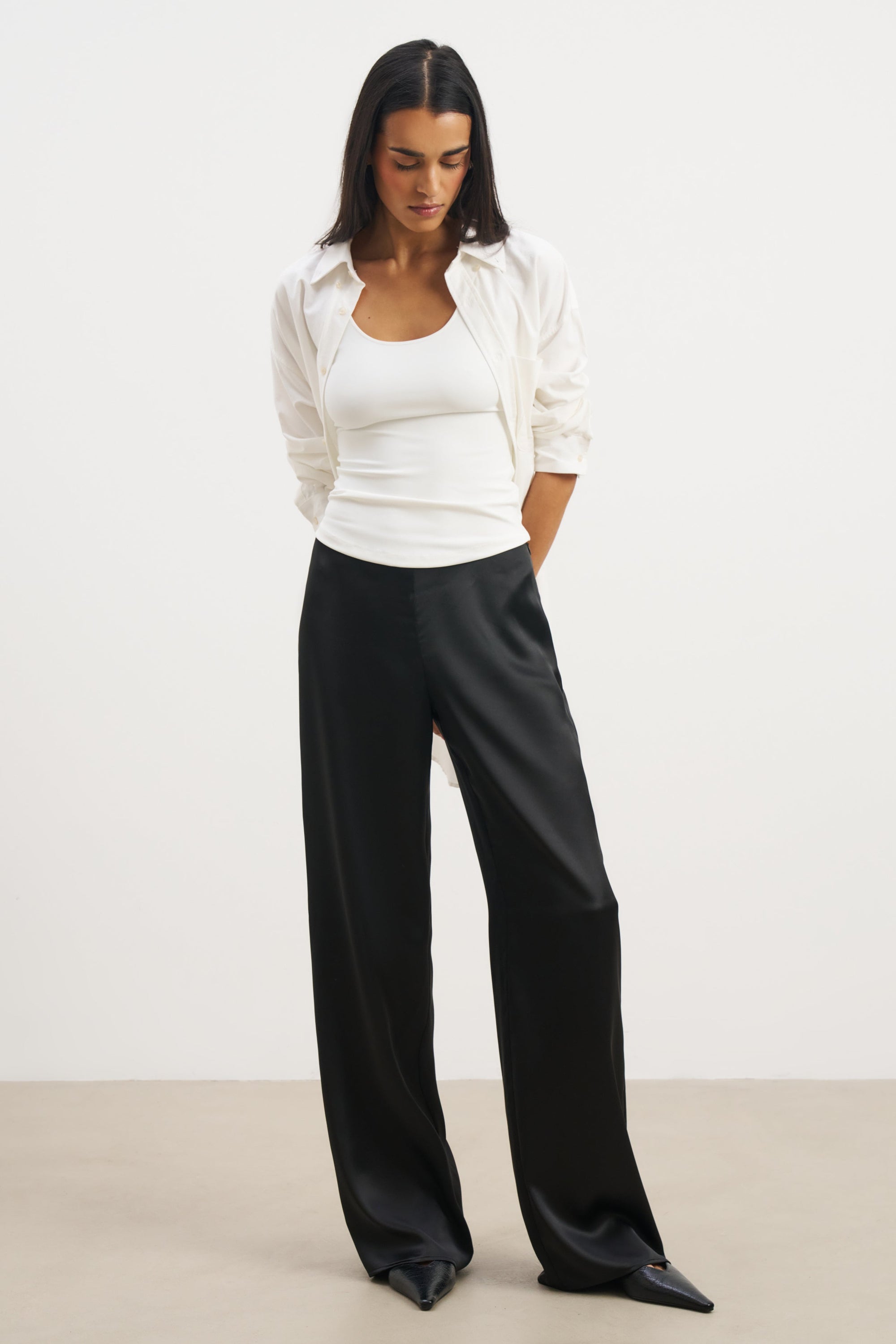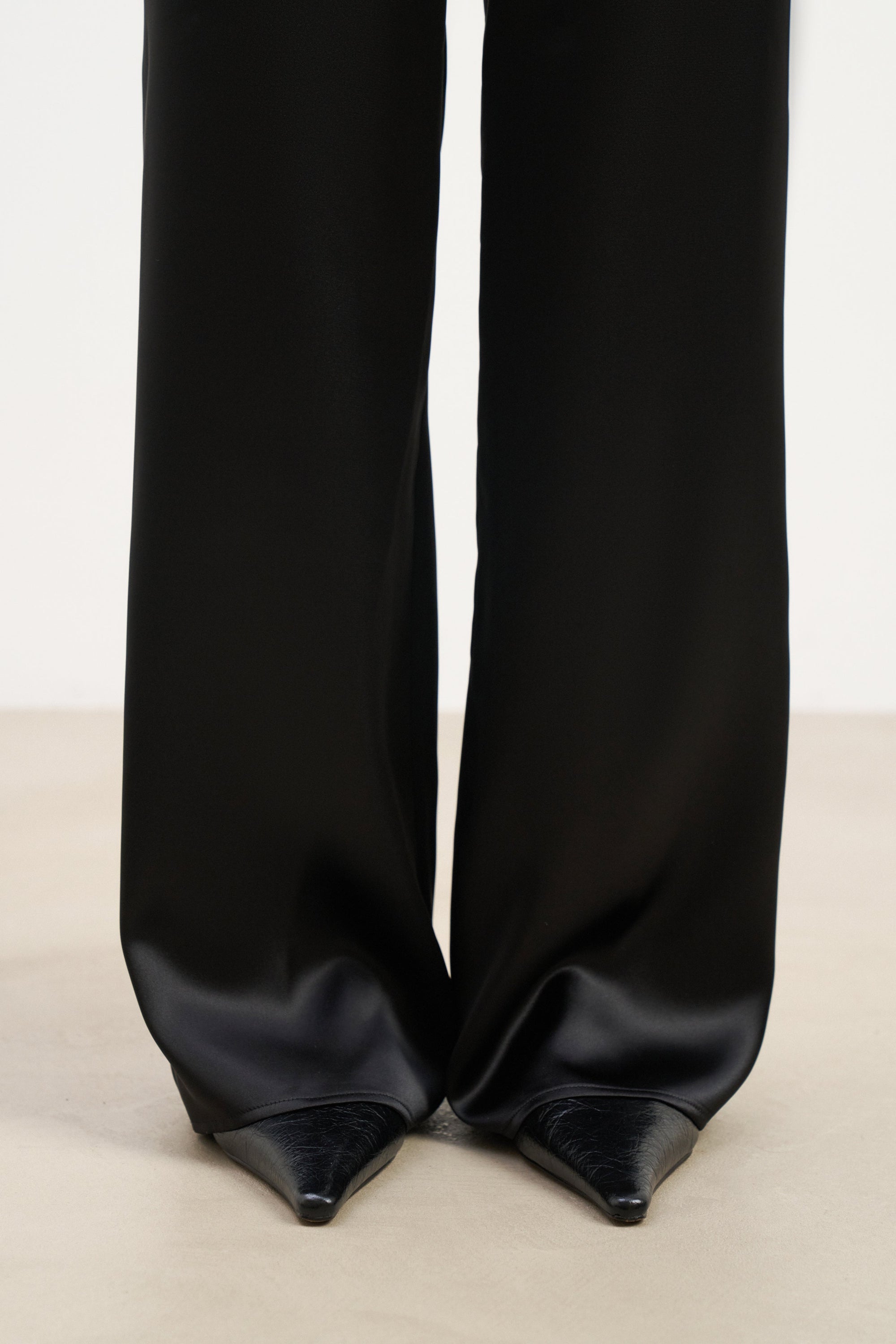 Formal cut wide leg trousers in a glossy, flowing mid-weight Satin fabric with a delicate bound trim waistband, mid rise cut and longline straight leg. Finished with an invisible side zip.