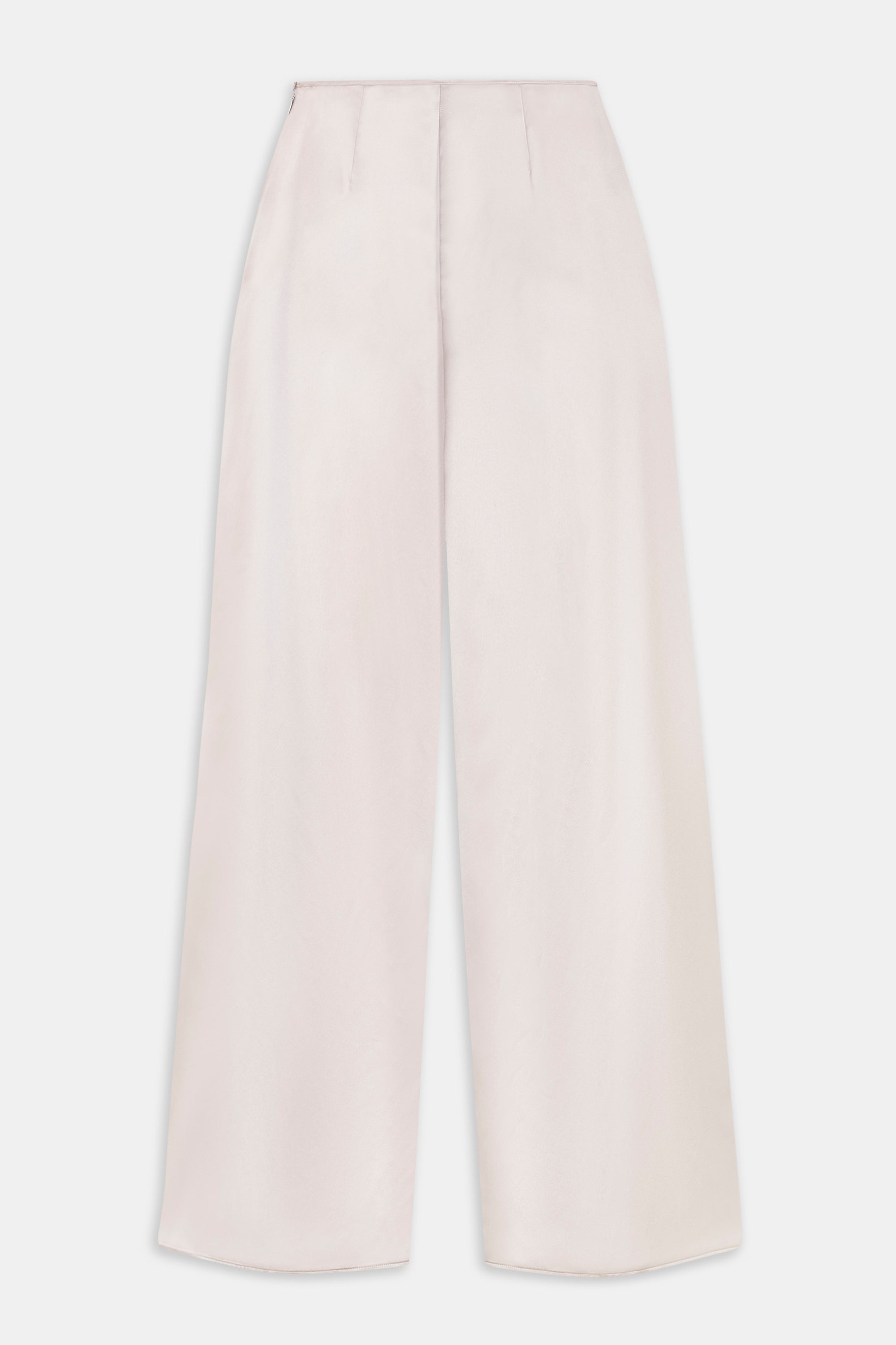 Minimalistic ultra wide leg trousers in a glossy, flowing mid-weight Satin fabric with a delicate bound trim waistband, mid rise cut and exaggerated ultra wide long leg. Finished with an invisible side zip.