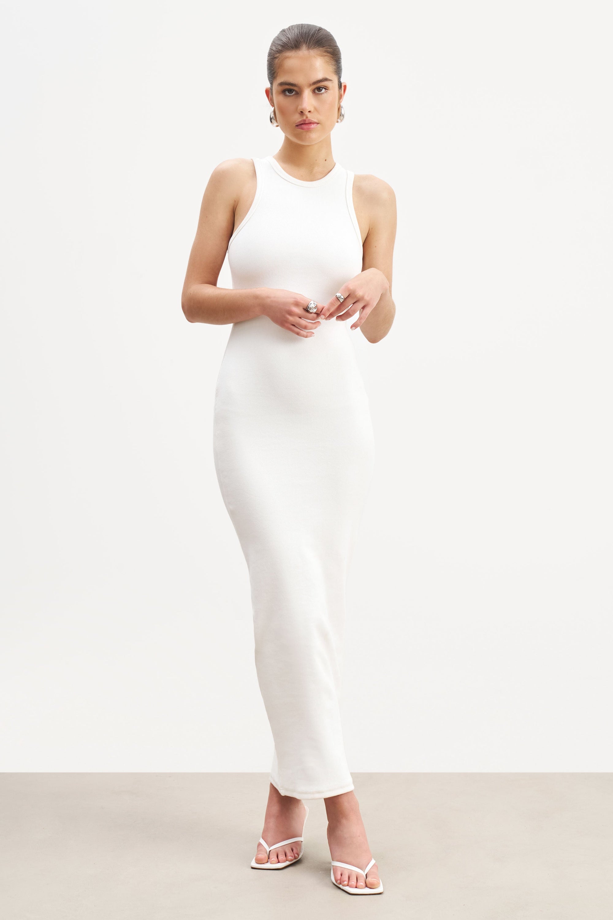 Maxi dress with a subtle racer vest cut in a thick and sculpting heavyweight ribbed cotton fabric with straight cut full length maxi skirt.
