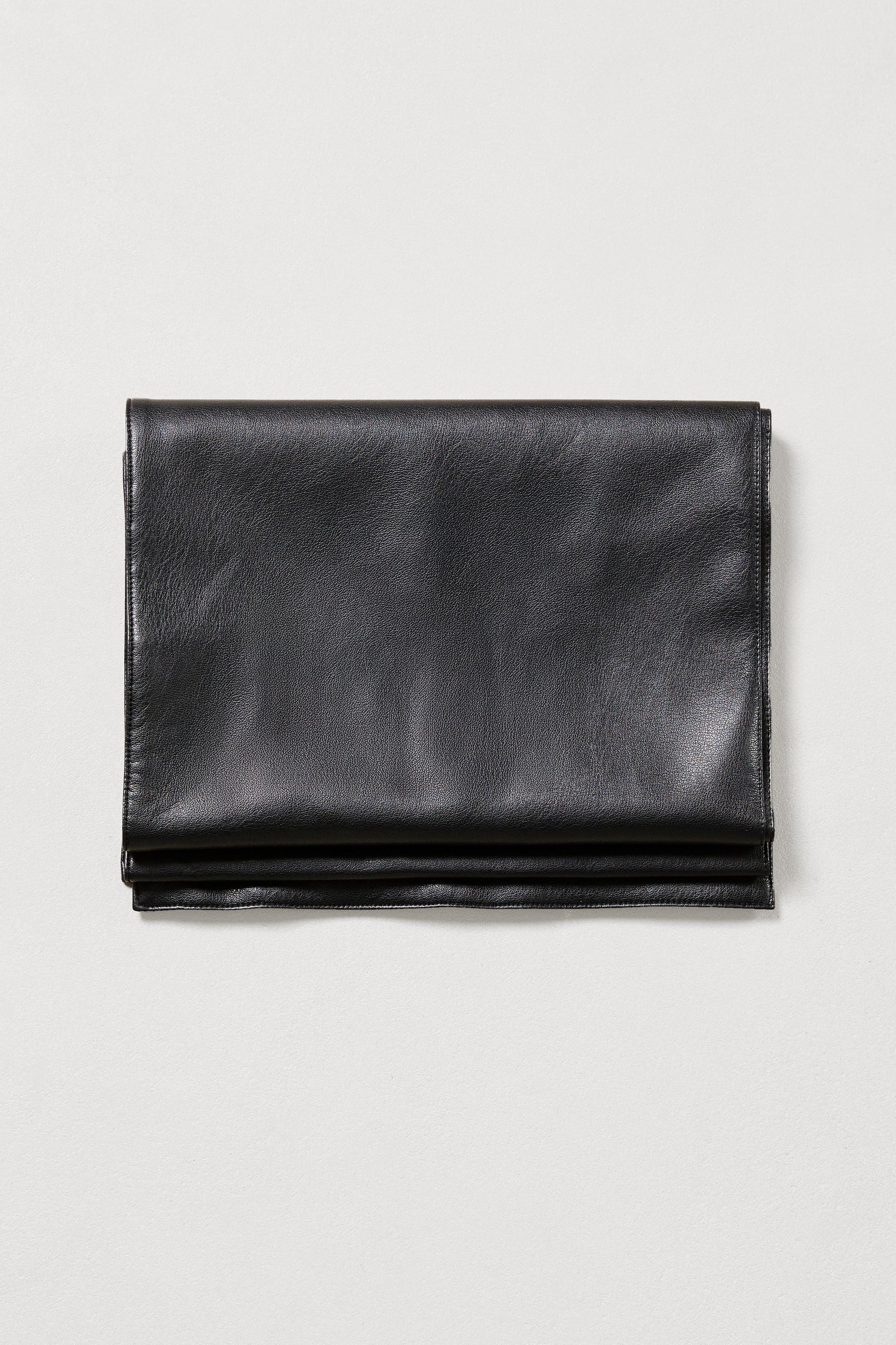 Minimal wide cut double sided longline leather scarf crafted from ultra realistic, buttery soft PU leather with decorative seam panels and stitching.