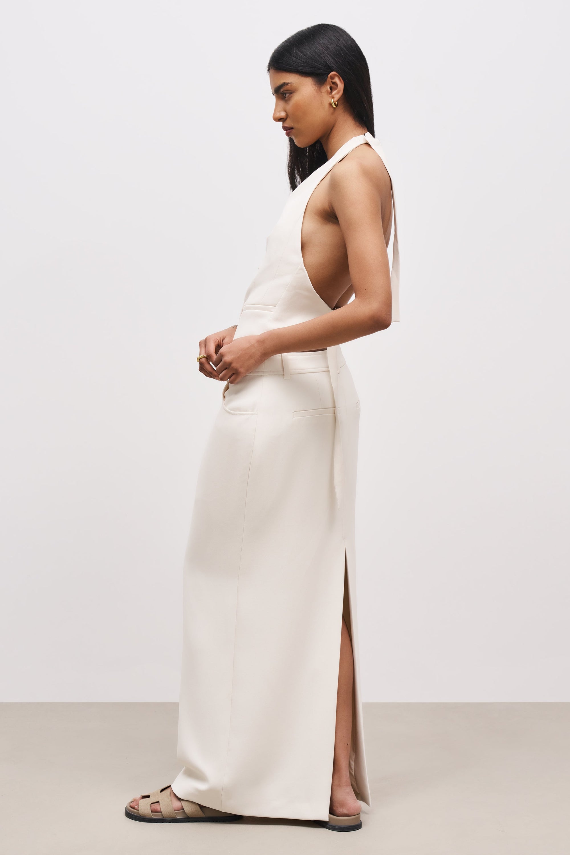 Mid-rise maxi skirt cut with a straight full length skirt in our signature flowing effortless tailoring fabric. Finished with belt loops, rounded front pockets and back patch pockets, high cut back vent and finished with zip fly and hook and bar closure. Fully lined.