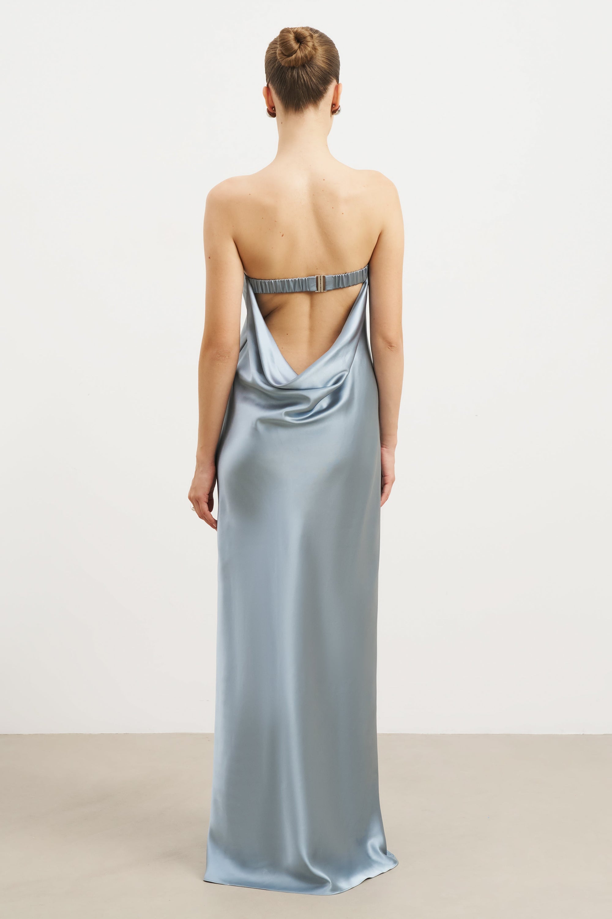 Bias cut strapless maxi length dress with a dramatic plunging cowl back and a column shaped longline skirt. Finished with a decorative elasticated back strap with metal hardware, invisible side pockets, plunging weighted u-shape cowl back and invisible silicone grip tape at the bust for support.