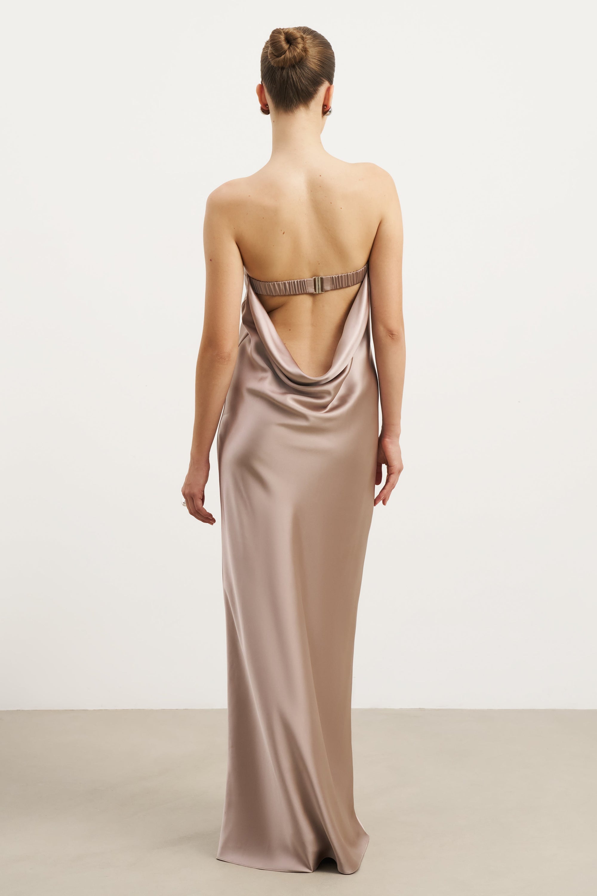 Bias cut strapless maxi length dress with a dramatic plunging cowl back and a column shaped longline skirt. Finished with a decorative elasticated back strap with metal hardware, invisible side pockets, plunging weighted u-shape cowl back and invisible silicone grip tape at the bust for support.