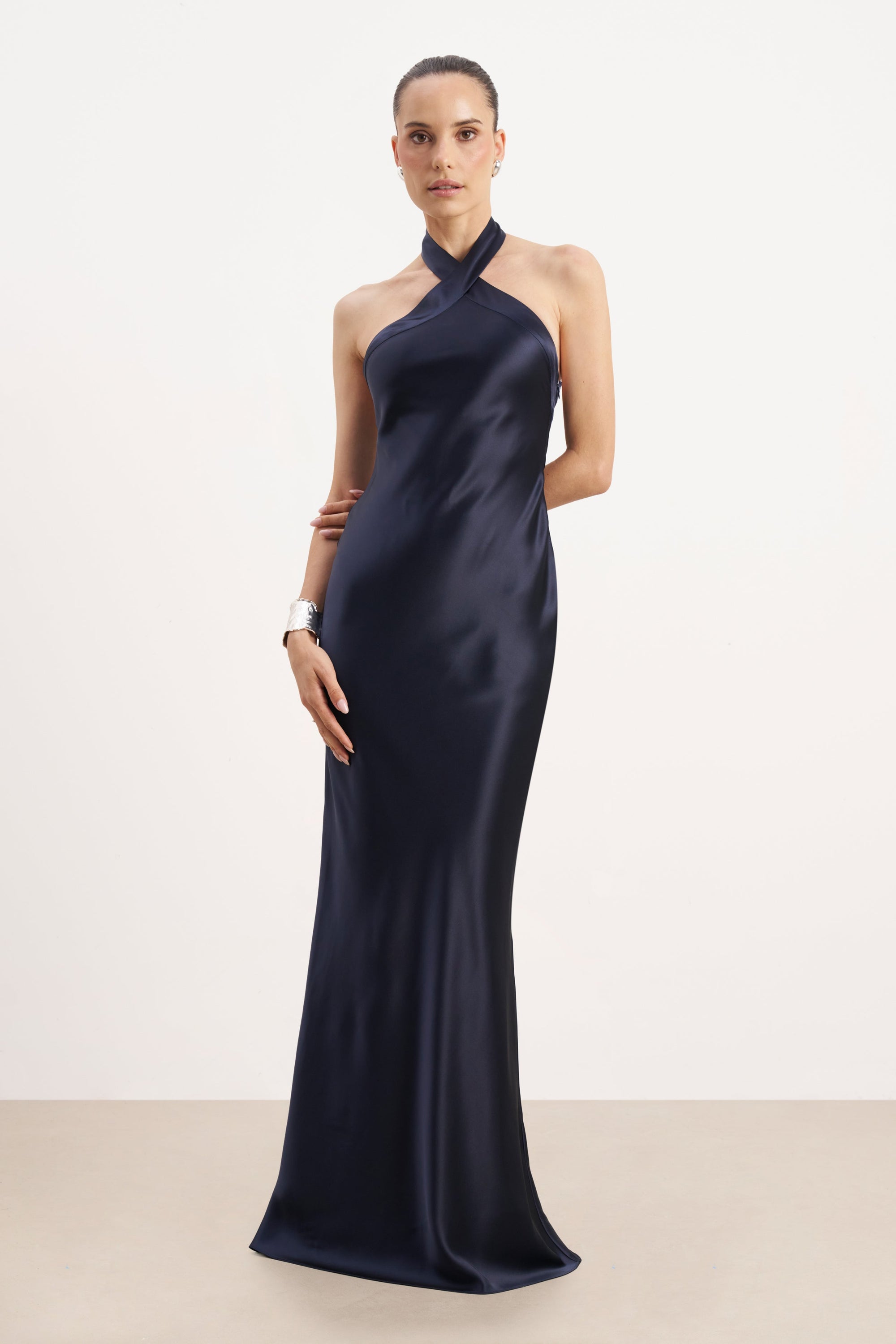 Maxi length halterneck dress with a decorative wide cut, criss-cross halter tie in a glossy, flowing mid-weight Satin fabric. Designed with a figure-skimming cut, flowing fluted maxi skirt, scooping low cut back and classic high cut halter neck. Finished with triple button neck closure and invisible side zip. Fully lined.