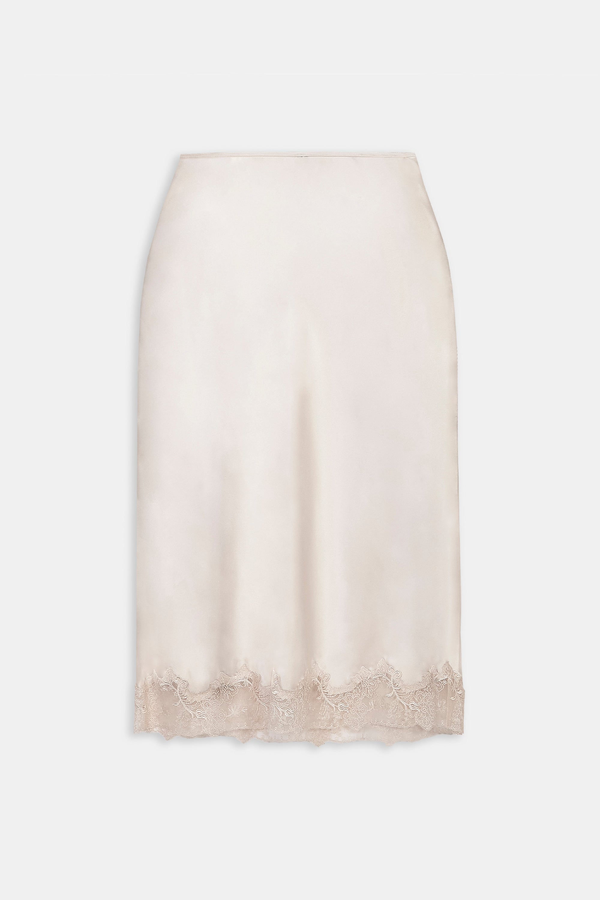 Midi length lace trim skirt in a glossy, flowing mid-weight Satin fabric with a delicate bound trim waistband, mid rise cut and 90's style fluted skirt. Finished with delicate lace appliqué trim to hem and an invisible side zip.