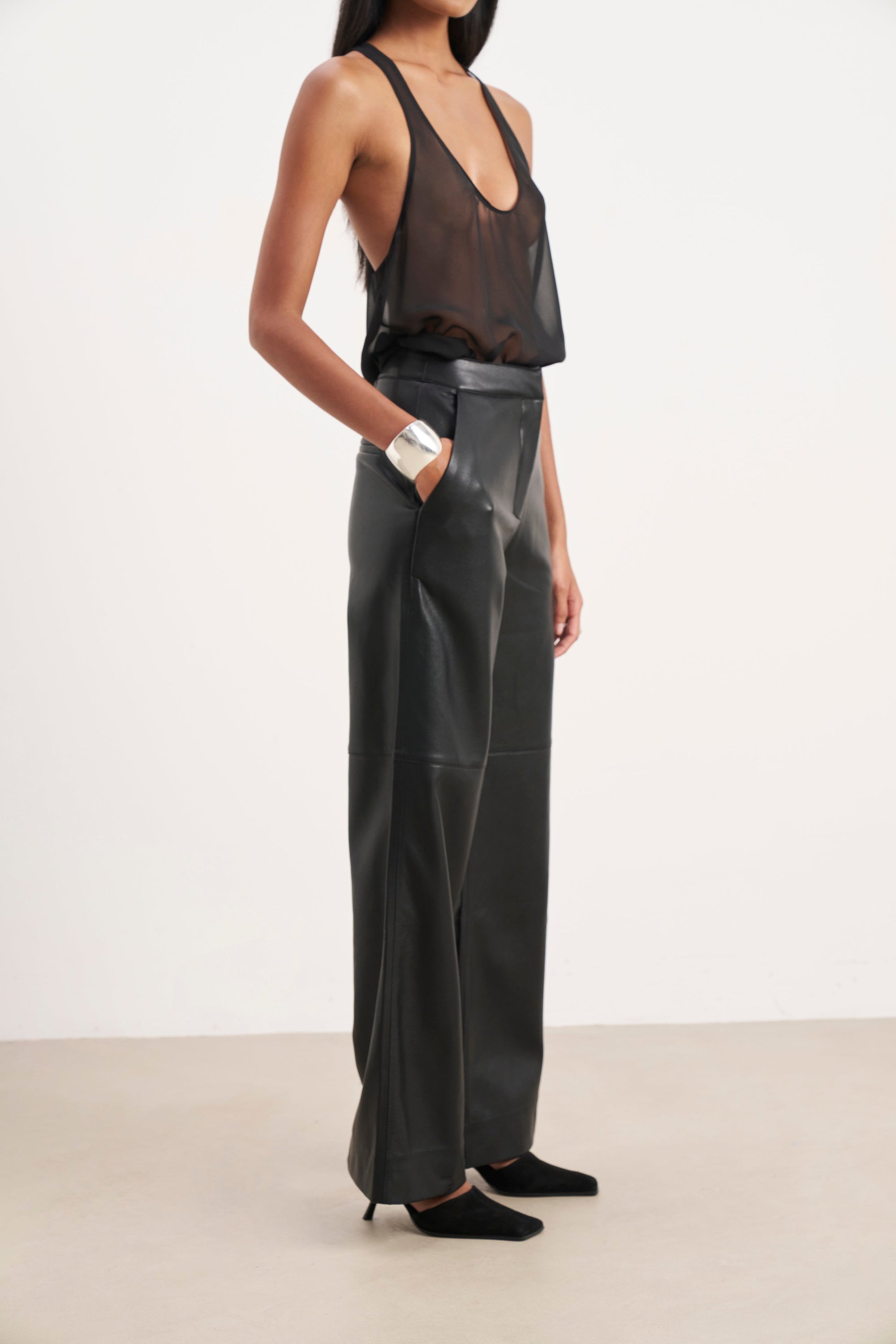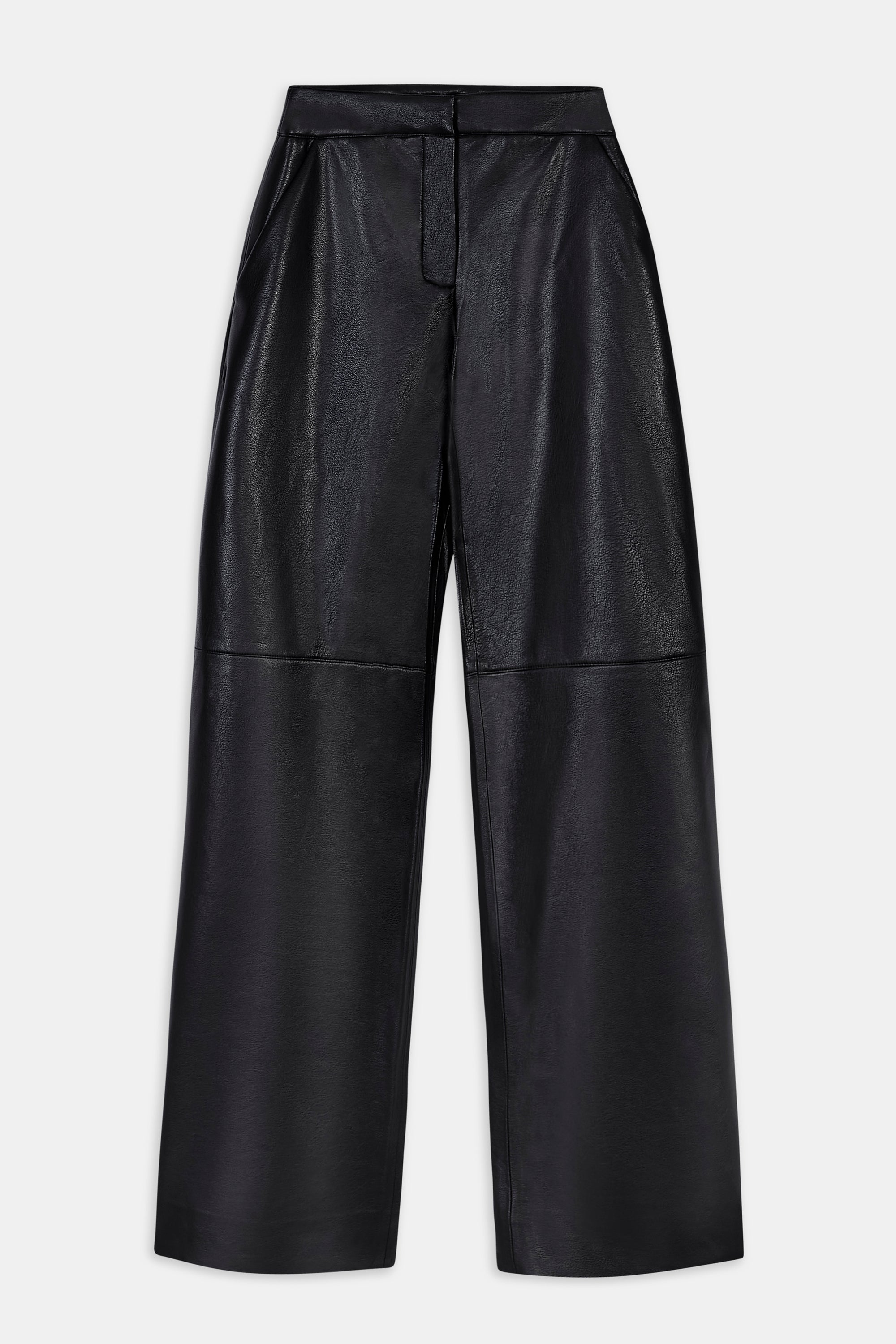 Wide leg trousers crafted from soft grained PU leather, tailored in a full length. Featuring panel detailing, slanted side pockets, two welted back pockets and finished with zip fly and hook and bar closure.