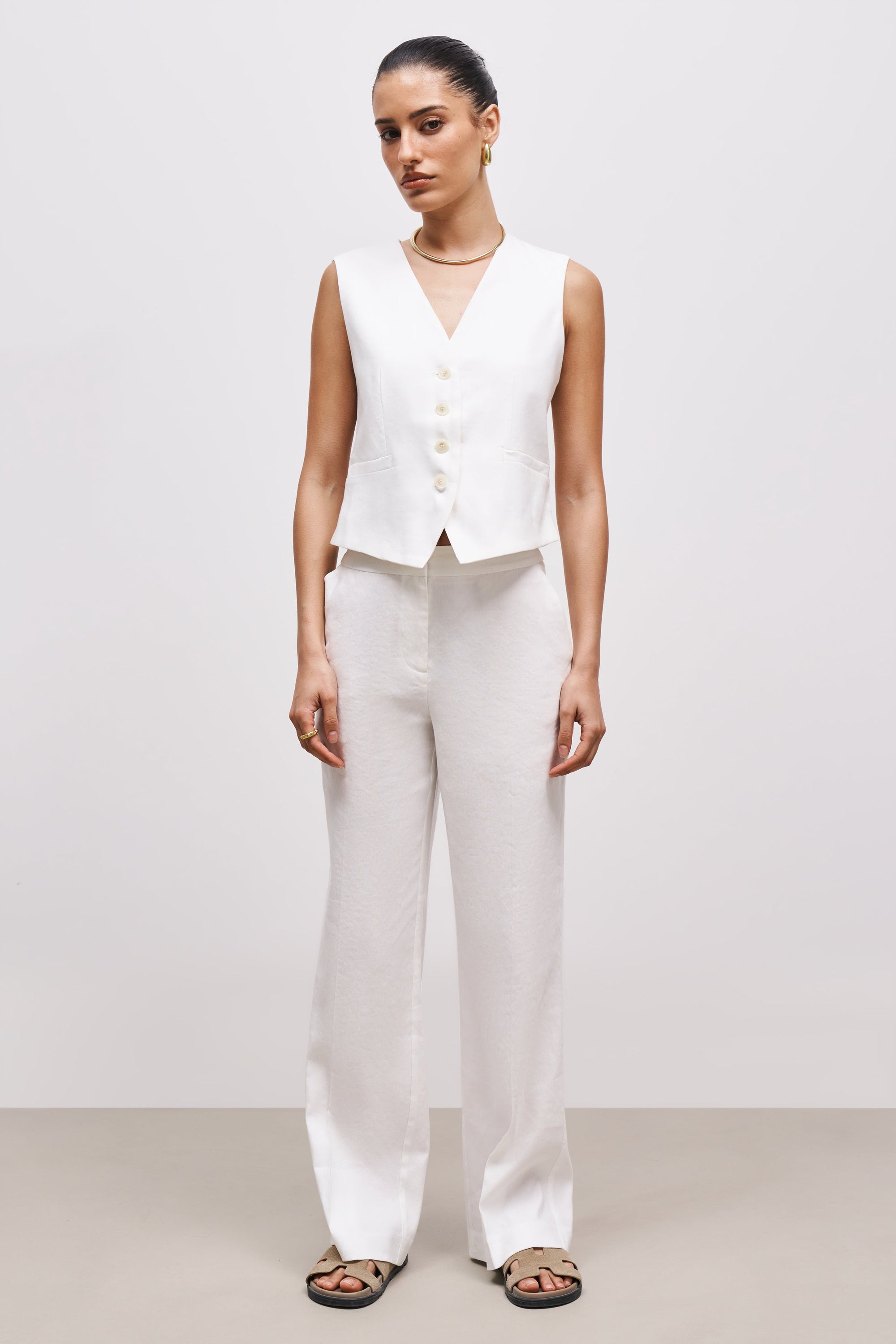 Tailored straight leg suit trousers with a mid-rise, finished with slanted side pockets, invisible hook and t-bar closure and back pocket detail, crafted in a light and airy linen and cotton blend fabric.