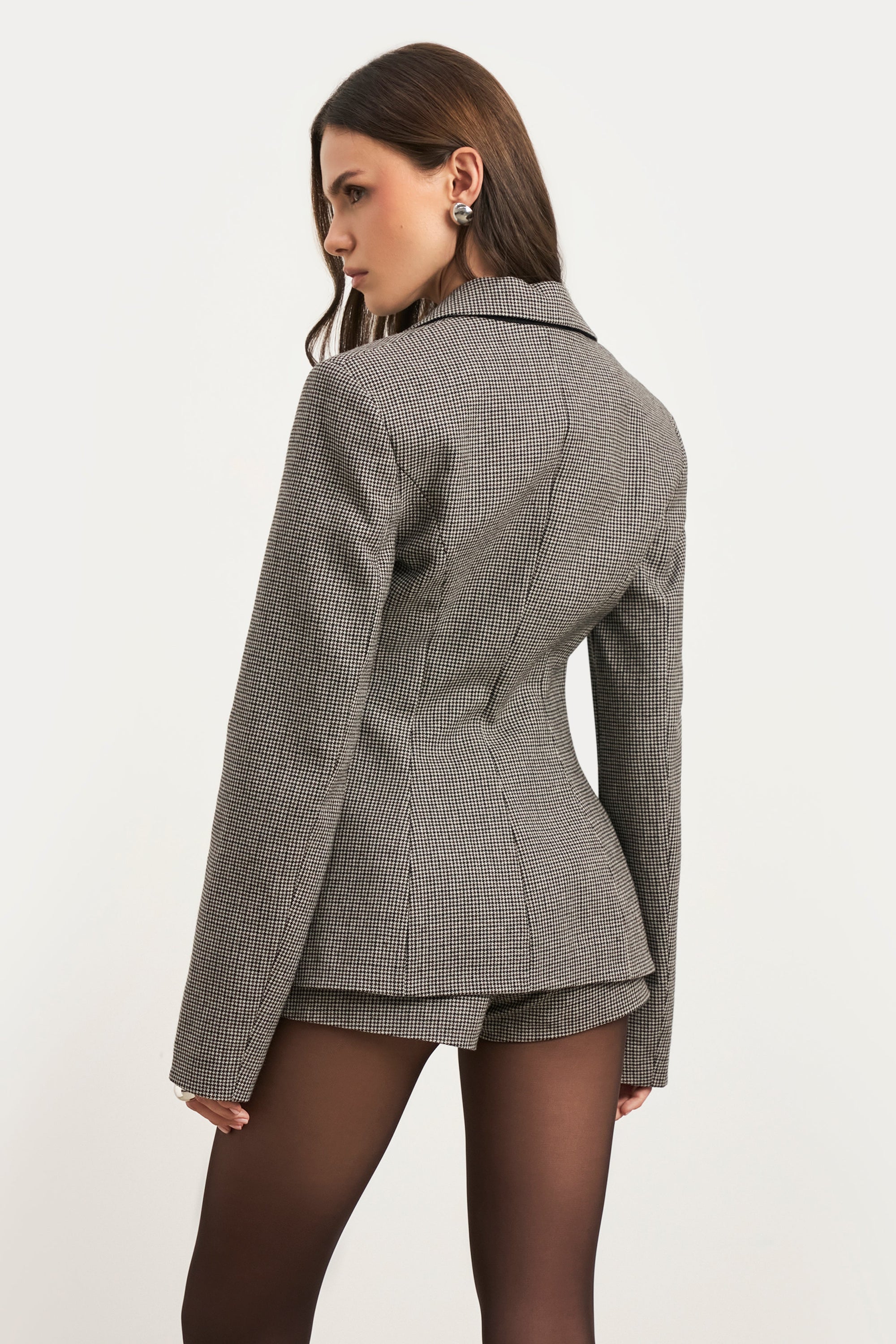 Tailored formal micro mini shorts in premium quality houndstooth wool blend fabric. Designed with a mid rise and a curved back hem for coverage. Finished with slanted side pockets, decorative welted back pockets, belt loops and zip fly with hook and t-bar closure. Fully Lined.
