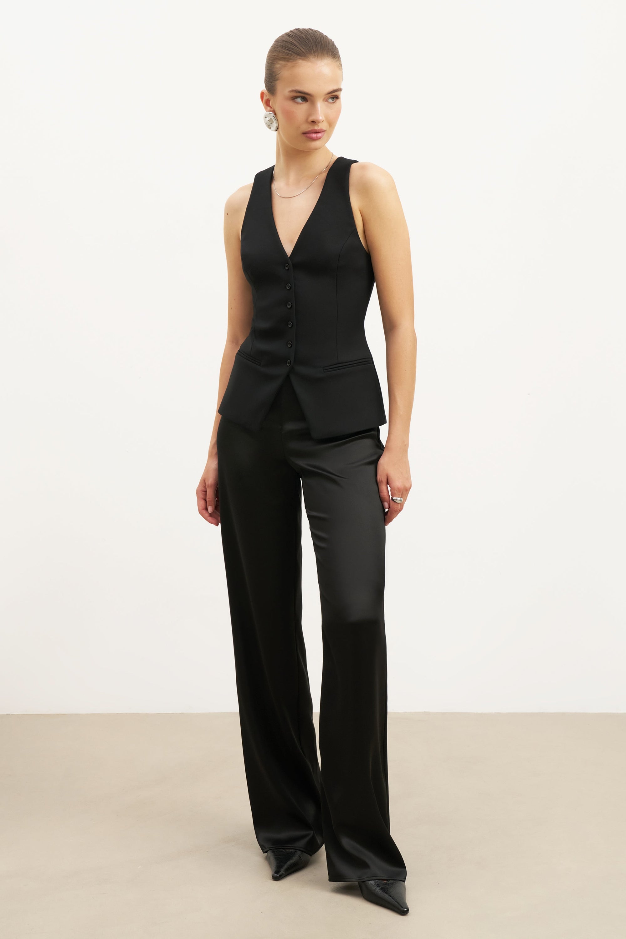 Fitted v-neck waistcoat top with a classic 50's style peplum hourglass cut in a heavyweight stretch tailoring fabric. Finished with delicate buttons and a flattering v cut neckline, with a darted waist and wider hem for an hourglass silhouette. Fully lined.