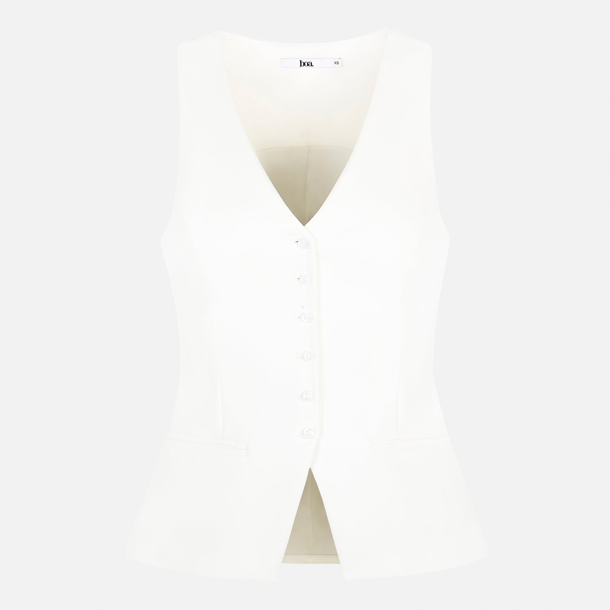 Fitted v-neck waistcoat top with a classic 50's style peplum hourglass cut in a heavyweight stretch tailoring fabric. Finished with delicate buttons and a flattering v cut neckline, with a darted waist and wider hem for an hourglass silhouette. Fully lined.